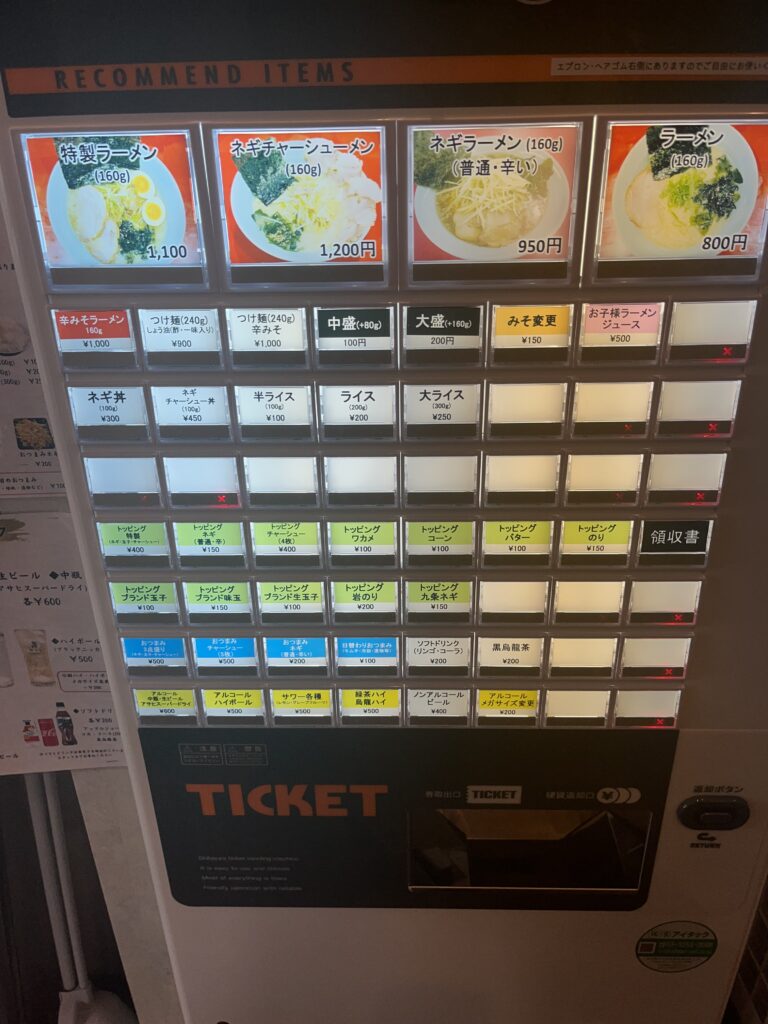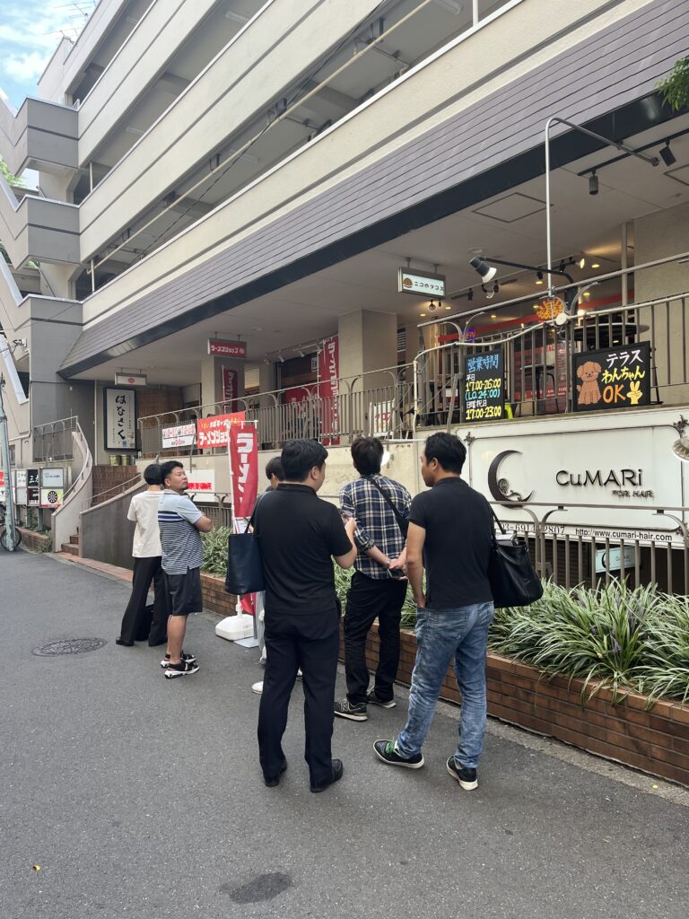 店の前に6人ほど座れるスペースがあり、待ち人数がそれ以上になれば階段の下に並ぶスタイルです。店の前まで来ると食券を買って待ちます。カウンターに座った際に麺の硬さなどをスタッフさんに伝えるタイプです。