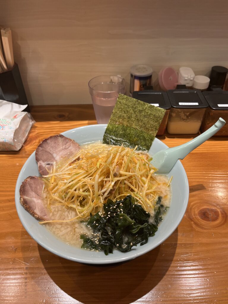 今回はネギラーメン(950円)の大盛り(+200円)を選びました。ネギラーメンはネギが普通か辛いか選べ辛いをお願いしました。麺は硬めであとは普通にしました。麺は中盛りが+80g、大盛りが+160gとなっています。