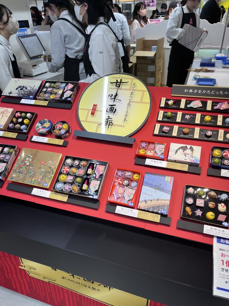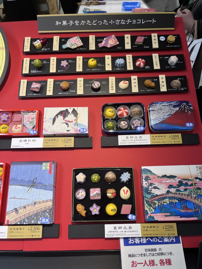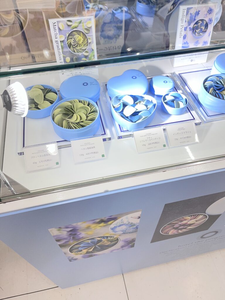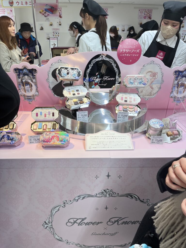 行列の先頭にあるゴンチャロフとフラワーノーズのカウンター。コスメブランドとのコラボでぱっと見ではチョコレートとは思えないデコレーションです。