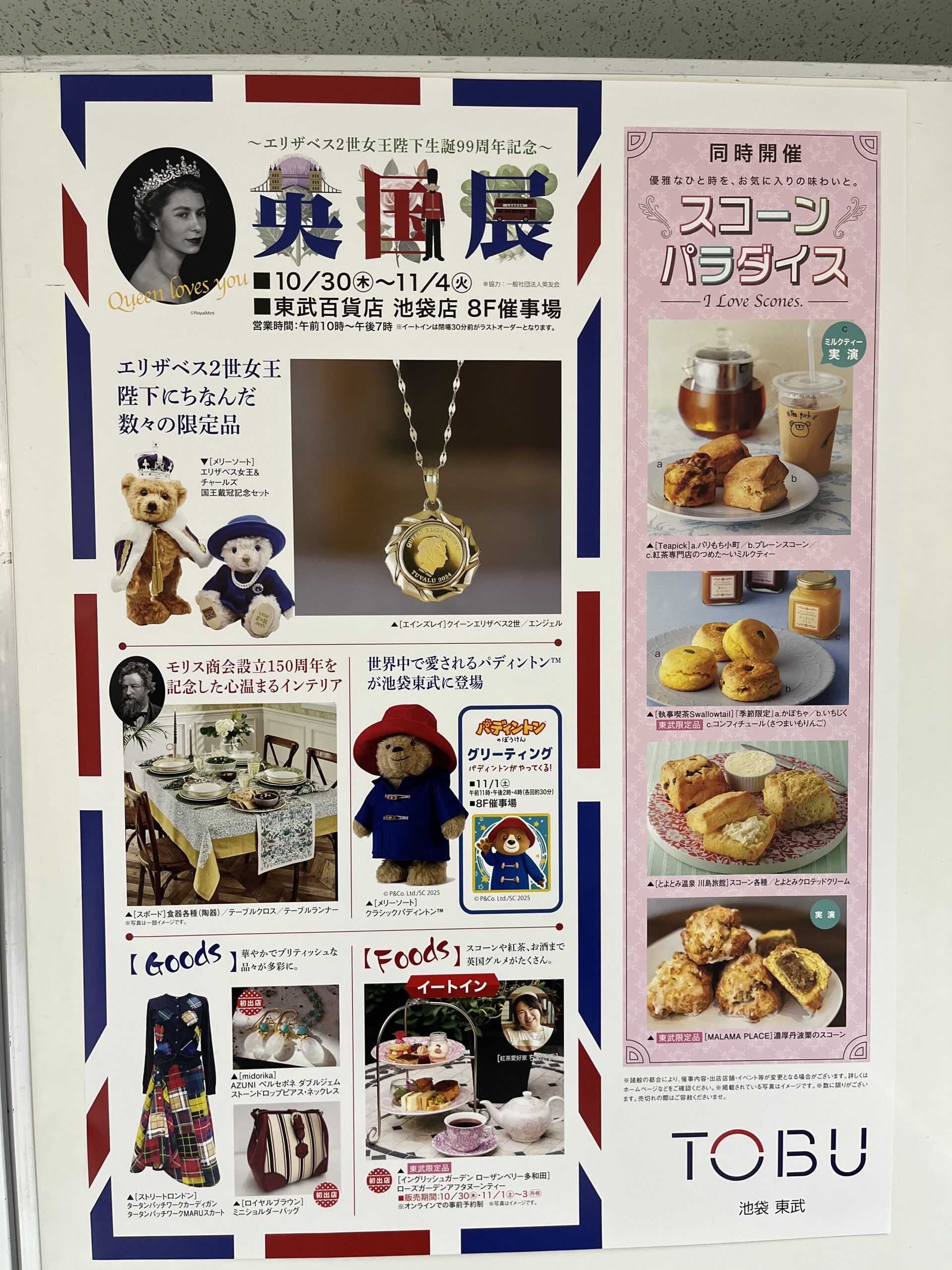 2025年10月30日より東武百貨店池袋店で始まったエリザベス2世生誕99周年記念英国展に行ってきました。そこかしこにユニオンジャックが吊り下げられ英国展を盛り上げています。