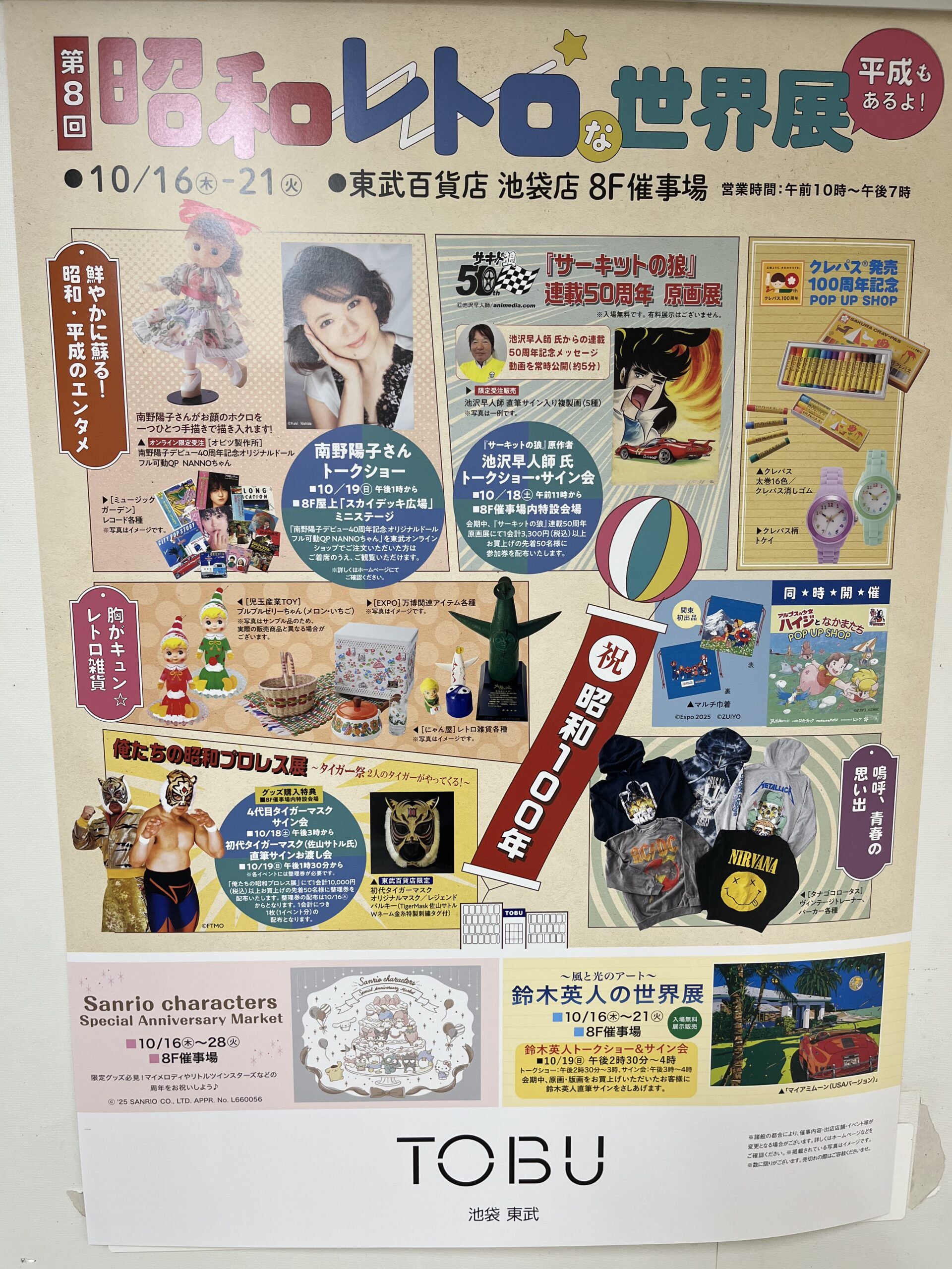2025年10月16日より東武百貨店池袋店で始まった第8回昭和レトロな世界展に行ってきました。今回は南野陽子さんのトークショー、「サーケットの狼」50周年原画展、クレパス発売100周年記念POP UP SHOP、俺たちの昭和プロレス展等が展示されています。https://www.tobu-dept.jp/ikebukuro/event/detail/8161