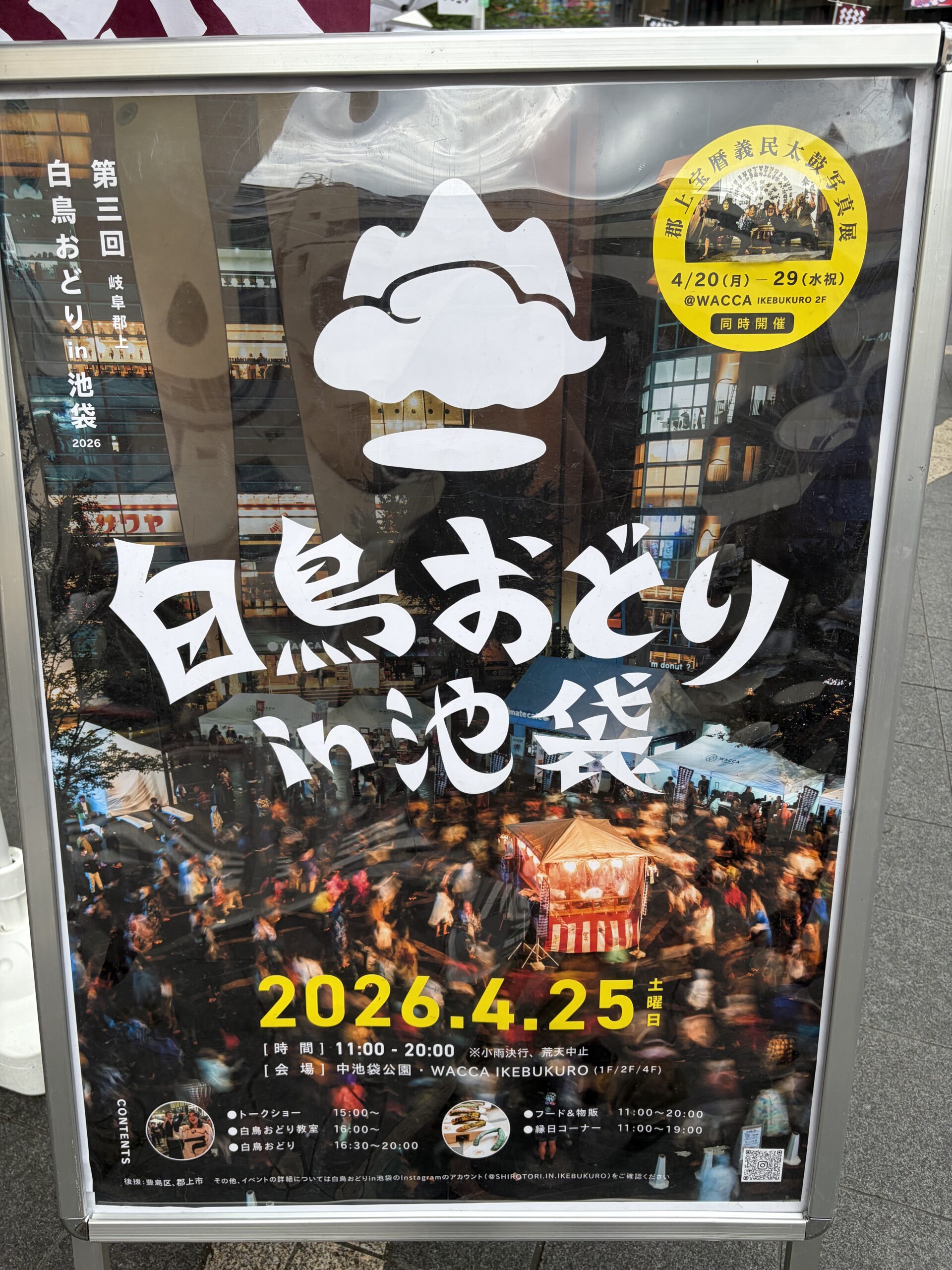 4月25日第三回岐阜郡上白鳥おどりin池袋2026が中池袋公園で行われました。三味線や笛、太鼓のヤグラを中心に中池袋公園が人々で溢れんばかりでした。なんともいえない独特のリズムの生演奏に合わせて熱気に満ちていました。16時より白鳥おどり教室が開かれ16時30分より白鳥おどり開始です。(第2部は18時30分開始)