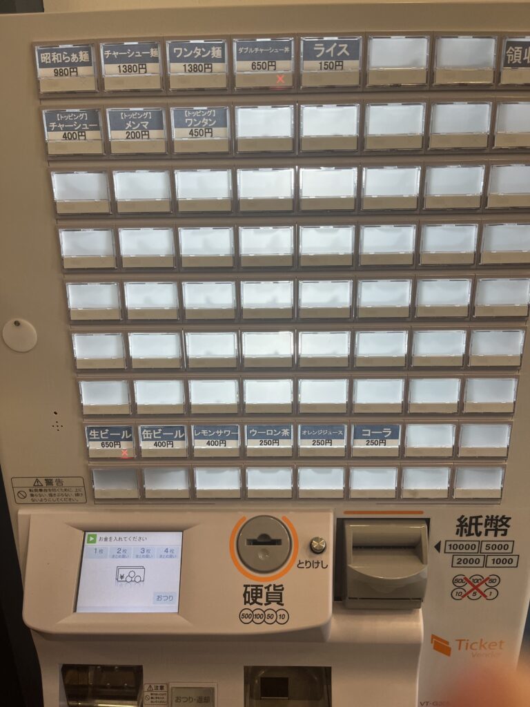 メニューは現状昭和ラーメン・チャーシュー麺・ワンタン麺の3種。入店したら右手の券売機で食券を購入するタイプです。券売機は現金のみ対応。
