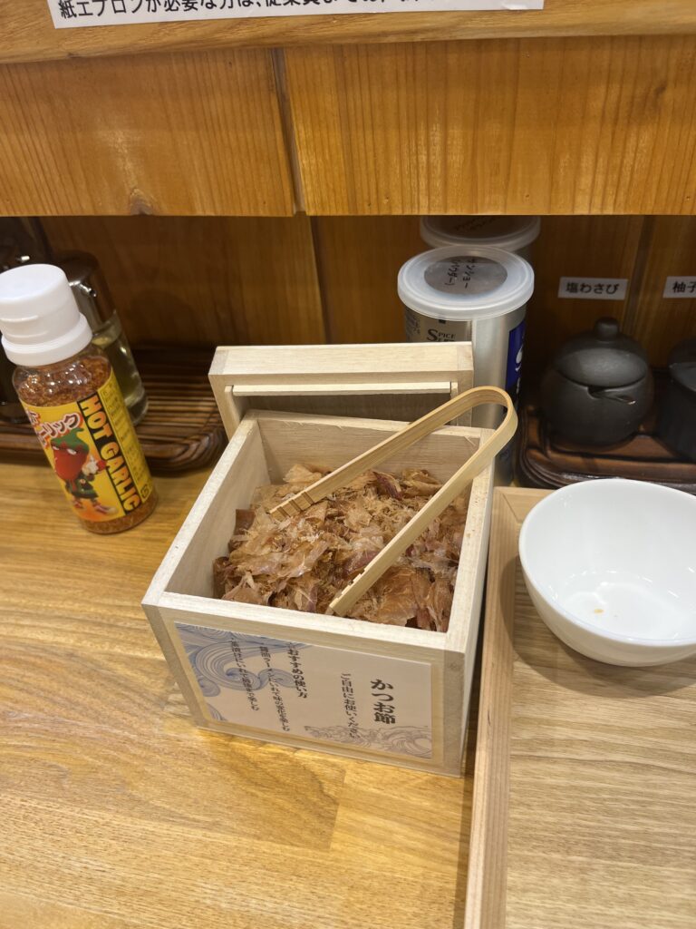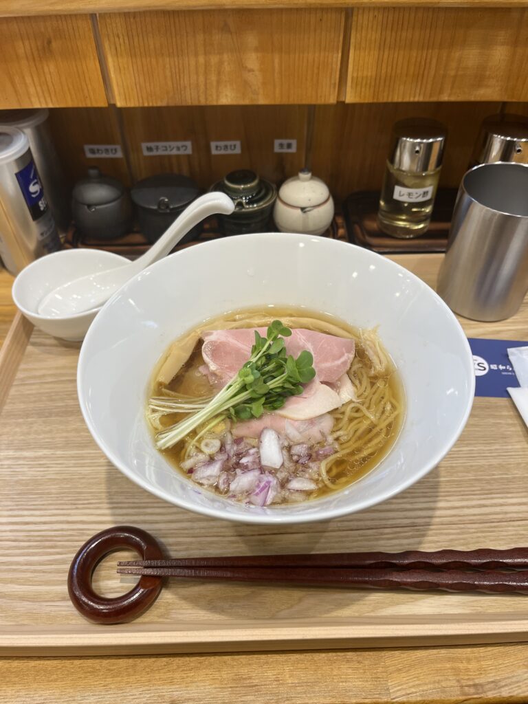 卓上には塩わさび・柚子コショウ・わさび・生姜と多くの調味料とかつお節が並び自分自身で味の変化つけることができます。昭和ラーメンはあっさりとしたスープと細麺ですっきりしたシンプルな醤油ラーメンという印象を受けました。