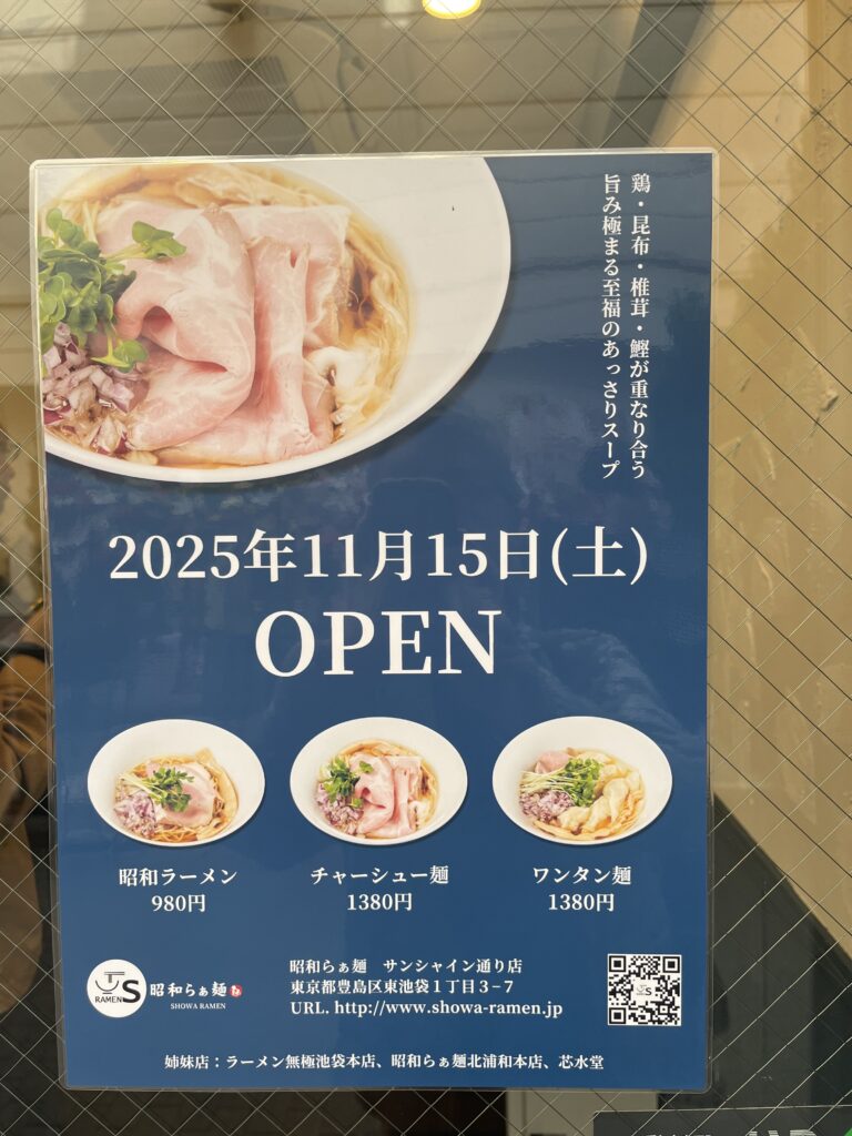 池袋東口に2025年11月15日にオープンした昭和らぁ麺で昭和らぁ麺を食べました。場所は池袋駅東口より徒歩約3分ヤマダ電機の向かい側です。