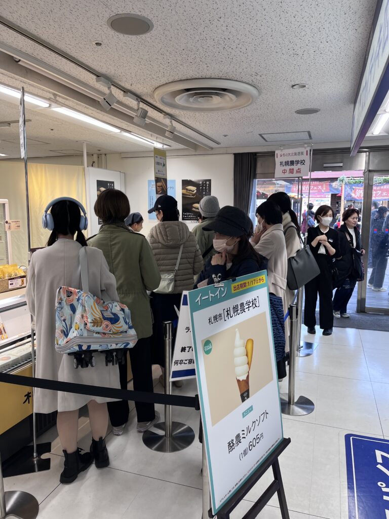 3番地エスカレーターからあがったところに札幌農学校(前半はフラノビジューが入っていたところ)が焼きたてクッキーサンドと酪農ミルクソフトを販売し長い行列ができています。